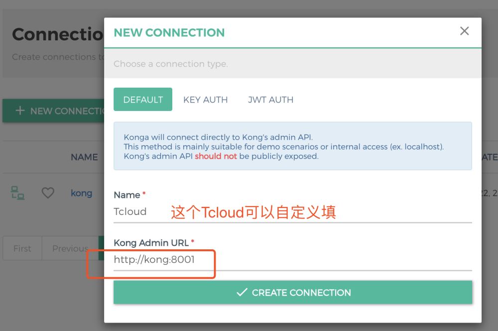 8、打开konga(kong的管理页面,http://localhost:9001),注册账号并登录,再新建连接,地址为http://kong:8001