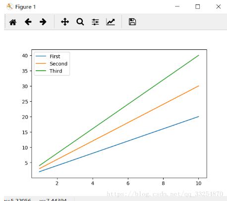 import numpy as np import matplotlib.pyplot as plt x = np.arange(1, 11, 1) plt.plot(x, x * 2, label="First") plt.plot(x, x * 3, label="Second") plt.plot(x, x * 4, label="Third") plt.legend(loc=0, ncol=1) # 参数:loc设置显示的位置,0是自适应;ncol设置显示的列数 plt.show()