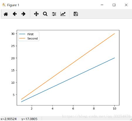 import numpy as np import matplotlib.pyplot as plt x = np.arange(1, 11, 1) fig = plt.figure() ax = fig.add_subplot(111) ax.plot(x, x * 2, label="First") ax.plot(x, x * 3, label="Second") ax.legend(loc=0) # ax.plot(x, x * 2) # ax.legend([”Demo“], loc=0) plt.show()