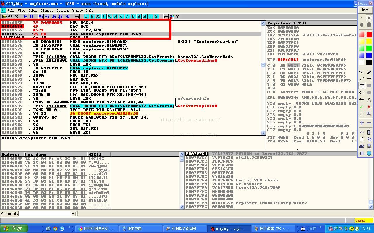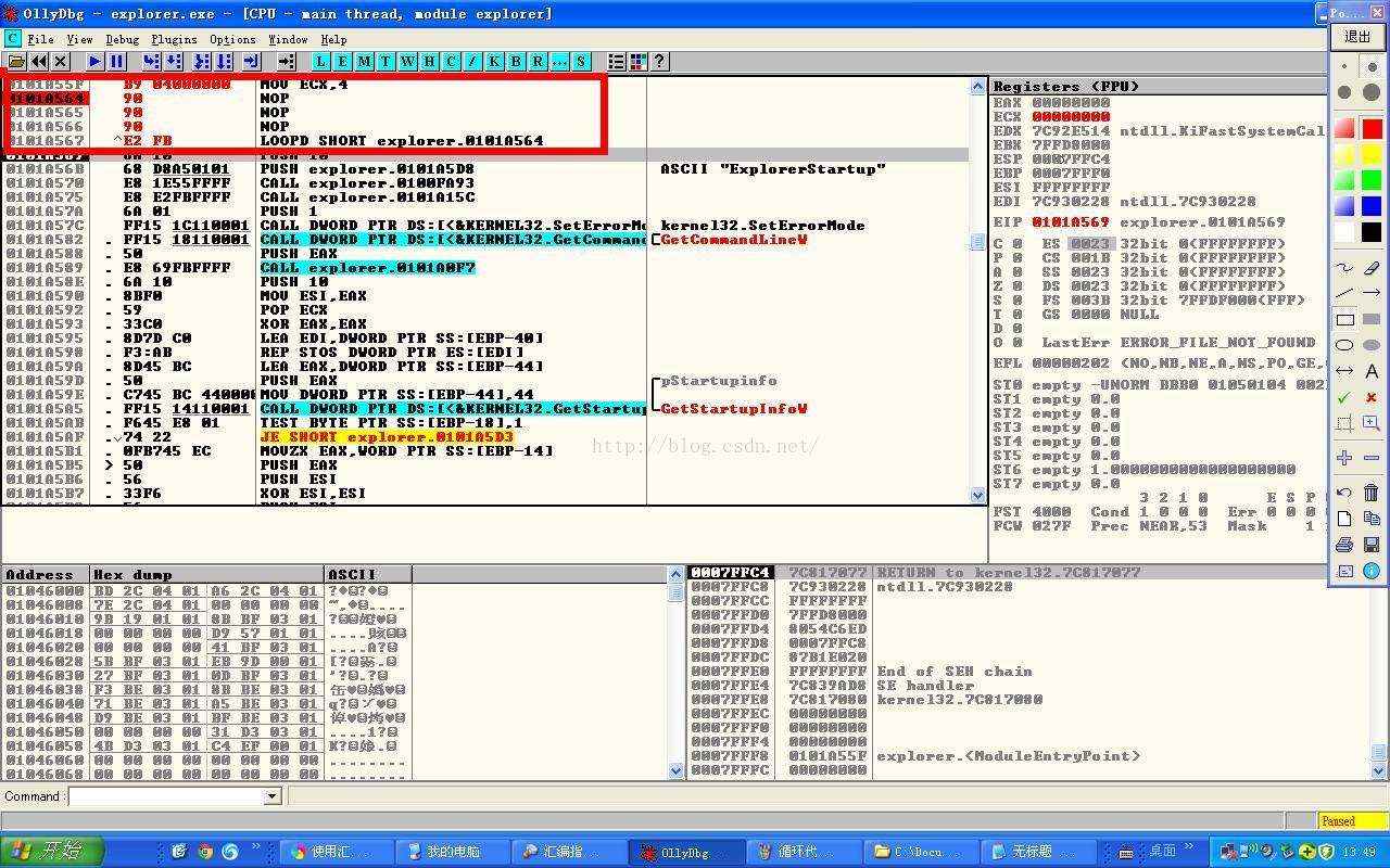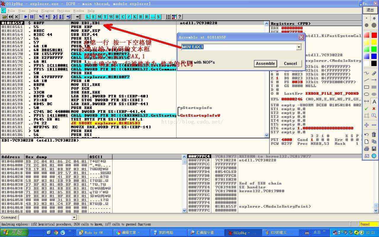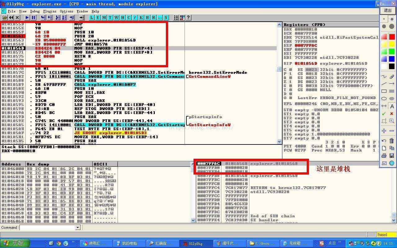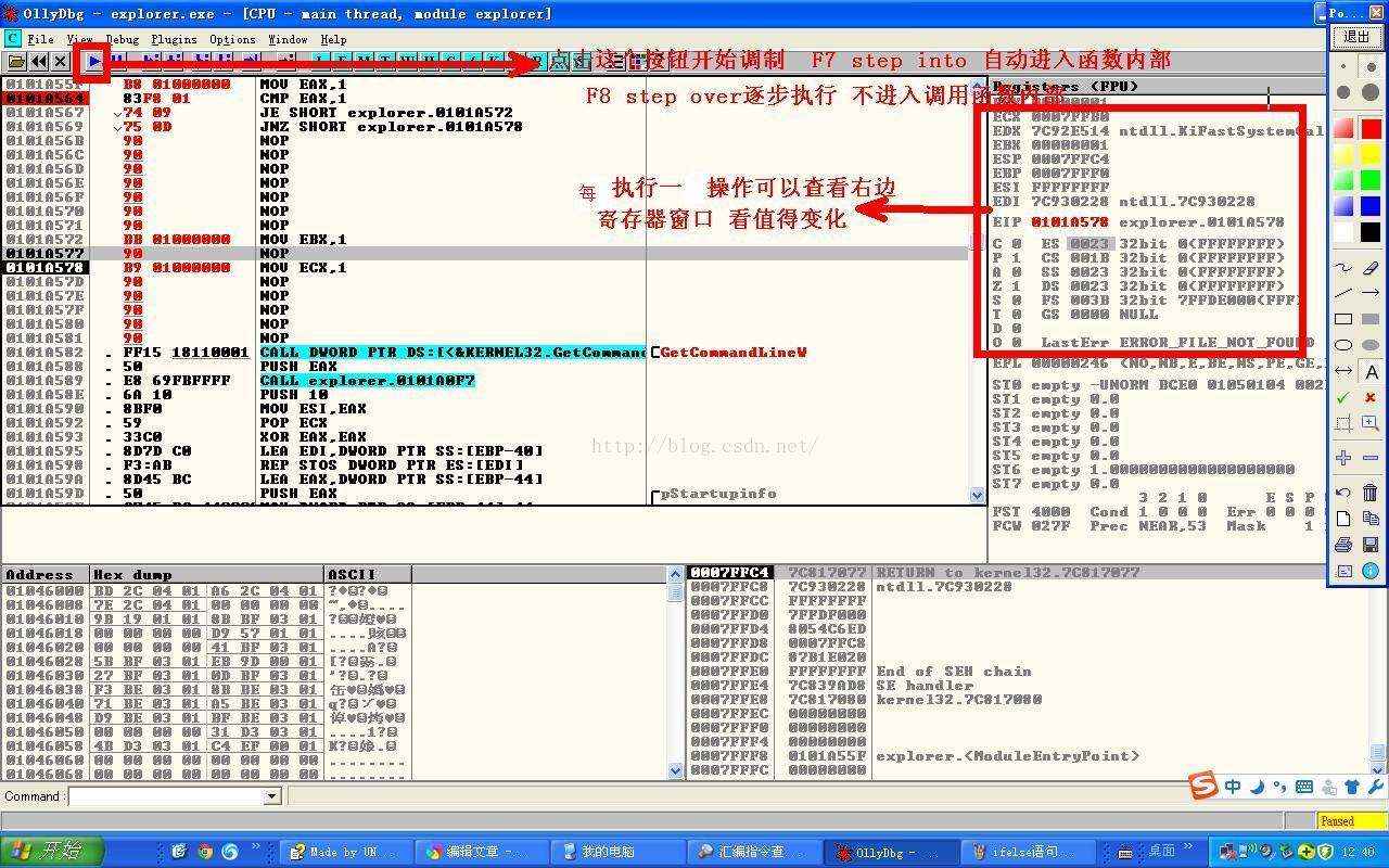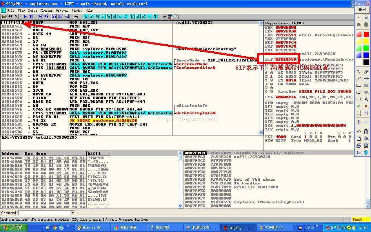 需要使用汇编来演示如下代码 需要下载ollydbg汇编调试器 点击File-Open随意打开一个exe文件 我这里随便找到c:/windows/explorer.exe文件