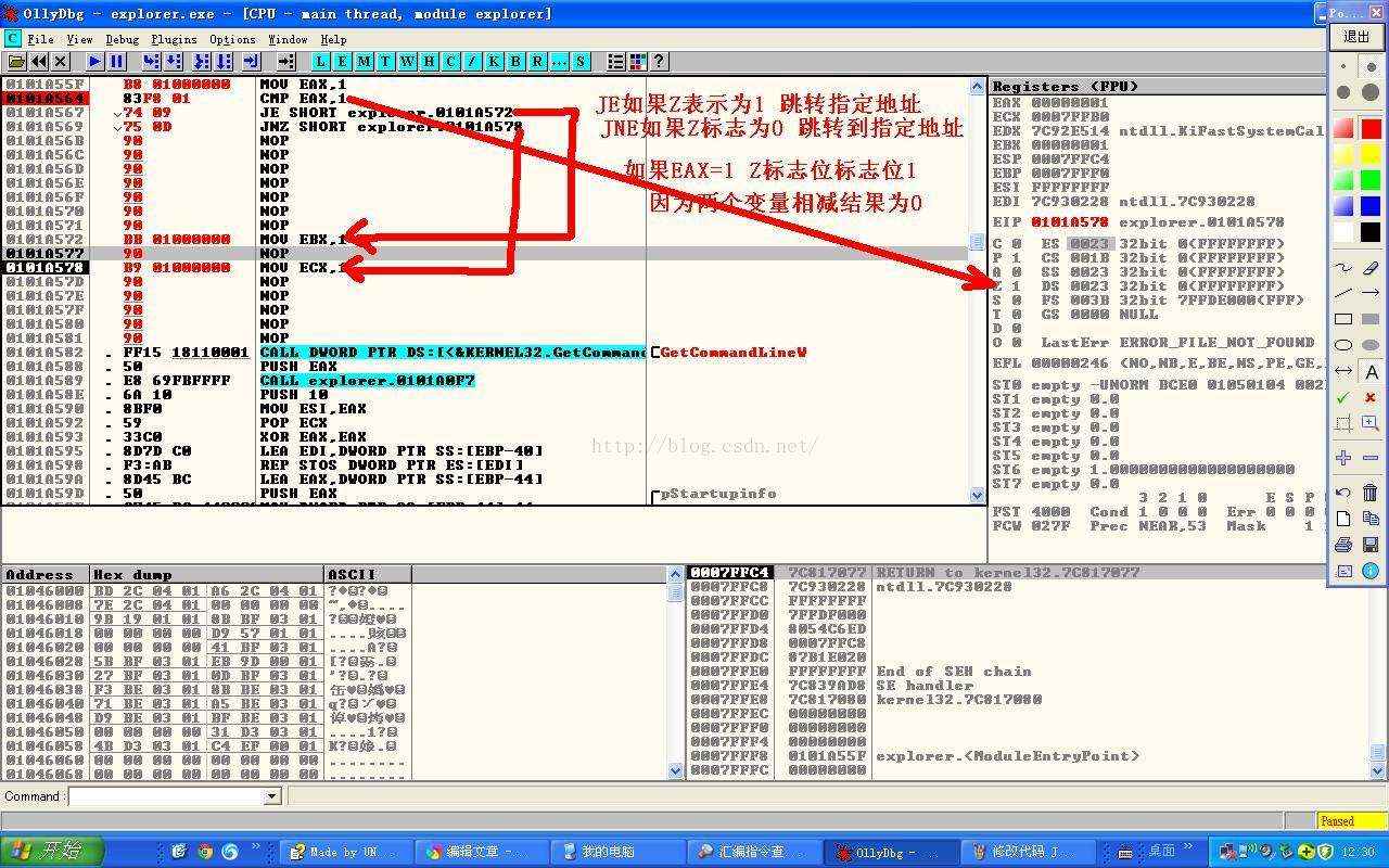 JE 0101A572 表示有条件跳转 当Z标志=1(也就是EAX=1) 自动跳转到后面指定的0101A572 地址 就会执行 move EBX,1