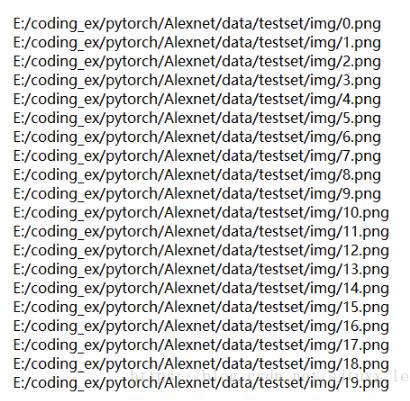 如果定义类的时候self.image_name = [x.strip() for x in img_file]这句没有strip掉,则输出的值将为'E:/coding_ex/pytorch/Alexnet/data/trainingset/img/0.png\n'