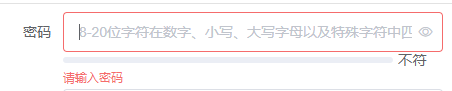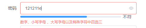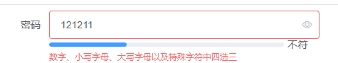 <div> <el-form :model="registerFormData" ref="registerForm" :rules="rules"> <el-form-item label="密码" :label-width="formLabelWidth" prop="password"> <el-input show-password type="password" v-model="registerFormData.password" autocomplete="off" placeholder="8-20位字符在数字、小写、大写字母以及特殊字符中四选三"></el-input> <el-progress :percentage="passwordPercent" :format="passwordPercentFormat"></el-progress> </el-form-item> <el-form-item label="再次输入密码" :label-width="formLabelWidth" prop="comfirmPassword"> <el-input v-model="registerFormData.comfirmPassword" autocomplete="off"></el-input> </el-form-item> </el-form> </div>