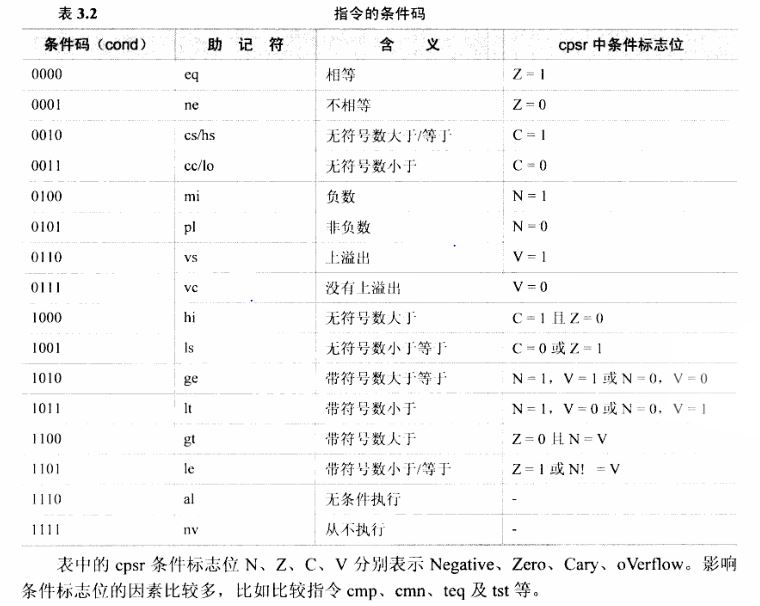 1){cond}:表示指令的执行条件,根据cpsr寄存器中的条件标志位决定是否执行该条指令,每条ARM指令包含4bit的条件码域,
