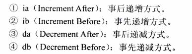 4)<register list>表示寄存器列表,对于ldm指令,从<rn>所对应的内存块中读取数据写入这些寄存器,对于stm把这些寄存器的值写入