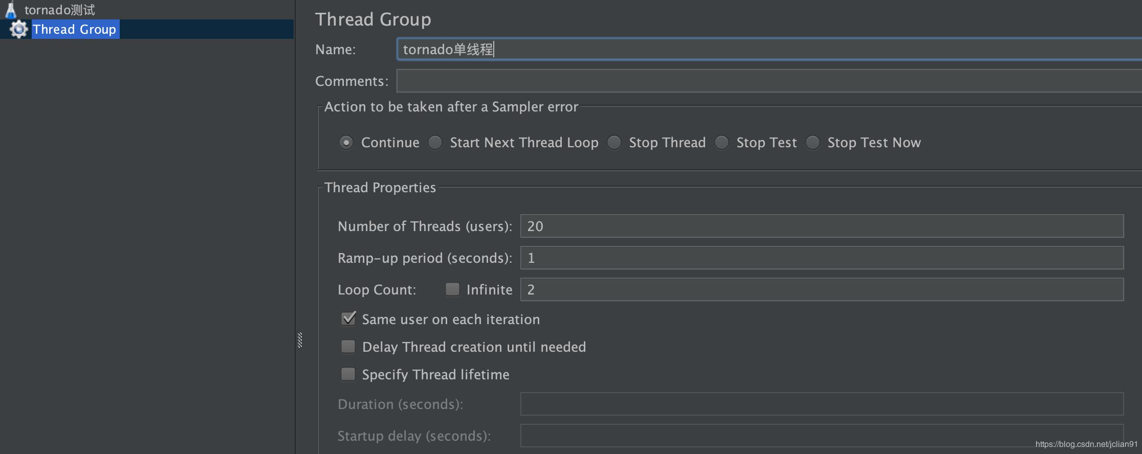 填写Thread Group的名称为“tornado单线程测试”,“Number of Threads”为20,表示模拟20个用户,“Ramp-Up period”为1,表示1秒内发送所有用户的请求,“Loop Count”为2,表示每个用户发送2次请求,因此一共为40次请求。