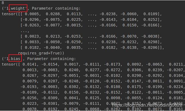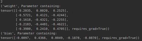 fc = nn.Linear(3, 5) params = list(fc.named_parameters()) print(params.__len__()) print(params[0]) print(params[1])