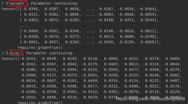 由于Linear默认是偏置bias的,所有参数列表的长度是2。第一个存的是全连接矩阵,第二个存的是偏置。