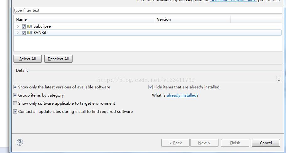 --> 将Subclipse和SVNKit打勾后,一路next或agree到结束即可(此处由于本人已经安装,因此next是灰色的)