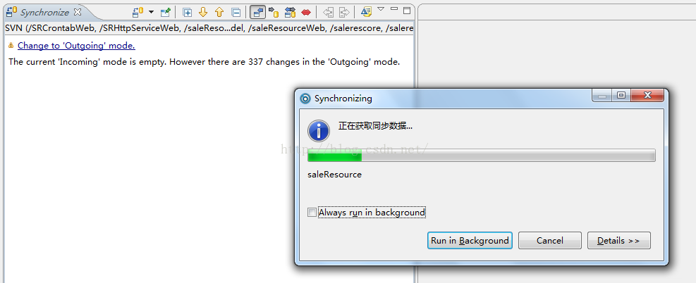 3.与本地代码有不同的服务器代码将显示在Synchronize视图下,双击可以查看本地代码和服务器代码的对比,加号的为新增的文件(本地还没有)