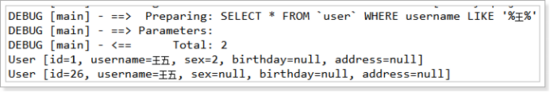 @Test public void testQueryUserByUsername1() throws Exception { // 4. 创建SqlSession对象 SqlSession sqlSession = sqlSessionFactory.openSession(); // 5. 执行SqlSession对象执行查询,获取结果User // 查询多条数据使用selectList方法 List<Object> list = sqlSession.selectList("queryUserByUsername1", "%王%"); // 6. 打印结果 for (Object user : list) { System.out.println(user); } // 7. 释放资源 sqlSession.close(); }