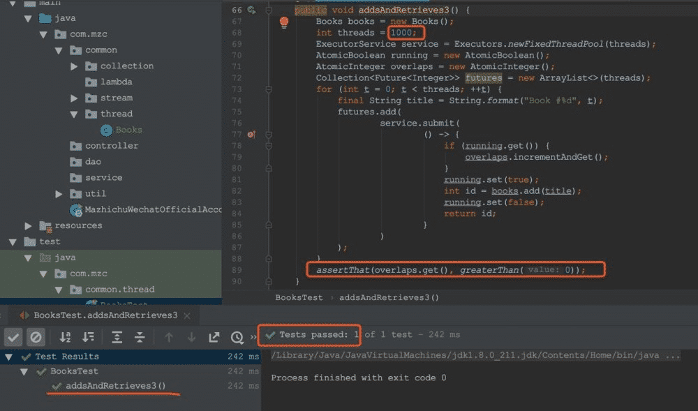 测试通过了,但这只是一个单线程测试。让我们尝试从几个并行线程中进行相同的操作(我使用的是Hamcrest):