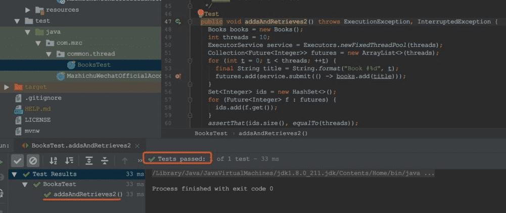 然后,我通过Future类型的对象列表获取其执行者的结果。最后,我计算创建的唯一图书ID的数量。如果数字为10,则没有冲突。我使用Set集合来确保ID列表仅包含唯一元素。