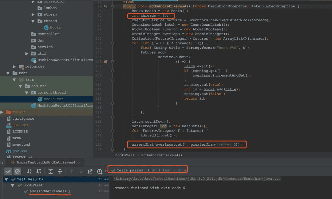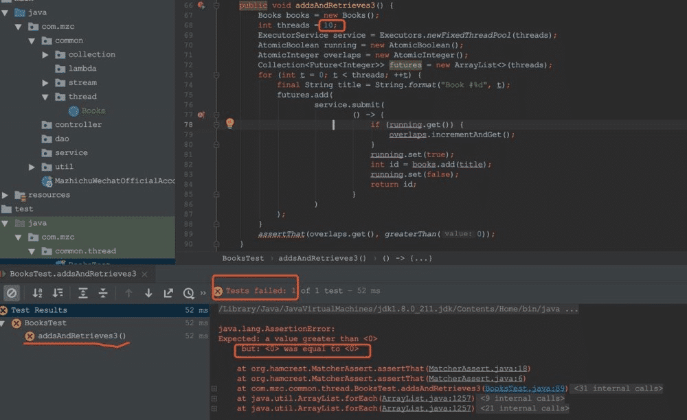 通过运行结果可以知道,现在线程数还是为10,但是线程的重叠数是大于0的,所以assertTrue执行通过,ids也不等于10了,也就是没有像以前那样得到10个图书ID。显然,Books类不是线程安全的!