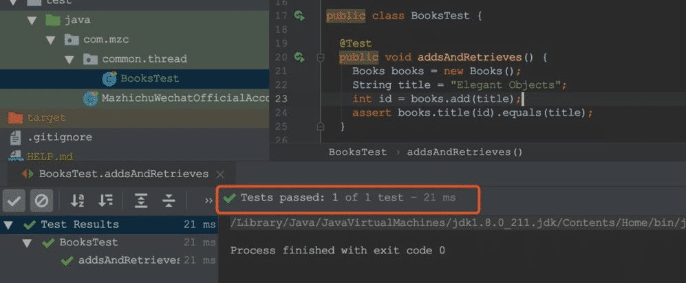 public class BooksTest { @Test public void addsAndRetrieves() { Books books = new Books(); String title = "Elegant Objects"; int id = books.add(title); assert books.title(id).equals(title); } }