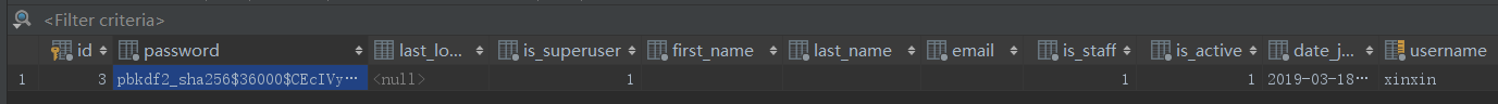 我们从表 auth_user 中可以看到生成了一条记录,里面的密码是经过加密的