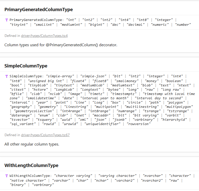 typeorm像名字中描述的那样,是个使用typescript编写的、类型系统非常完整的数据库关系映射,放张数据类型截图: