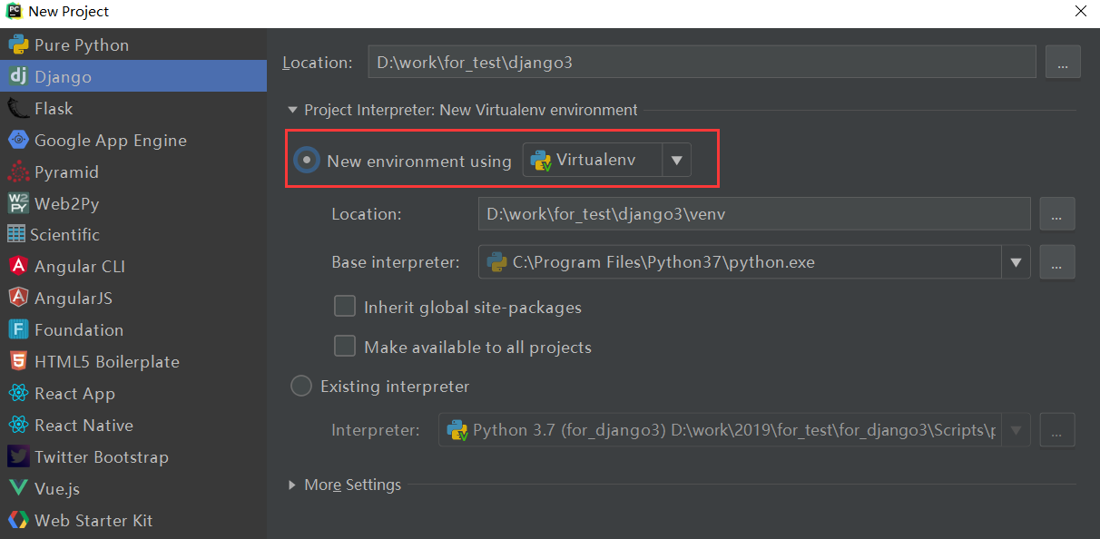利用Pycharm的方便,直接通过virtualenv创建虚拟环境,并安装Django3.0。