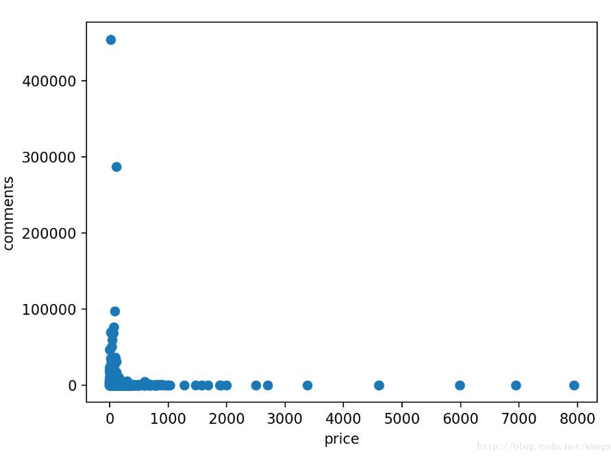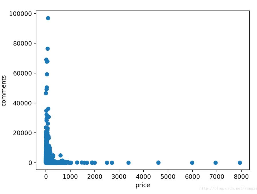 结果如下图,价格为0左右时comment很大可能为异常值,comments为0时,价格极大这个有可能的。