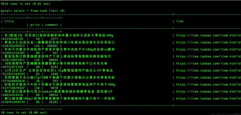 其中总数据为9616行,列分别为title,link,price,comment