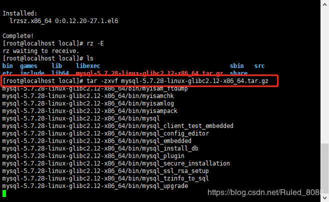 1.2 将导入的Mysql压缩包进行解压,输入:tar -zxvf mysql-5.7.28-linux-glibc2.12-x86_64.tar.gz命令