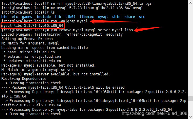 如果卸载不成功 表示关联文件,输入:rpm -e --nodeps mysql-libs-5.1.71-1.el6.x86_64命令进行强制卸载