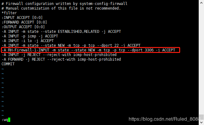 进入防火墙配置文件 vi /etc/sysconfig/iptables