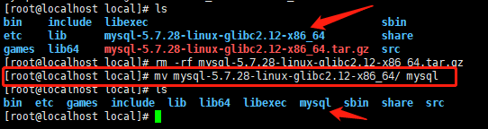 1.3 解压完成后,将解压后的文件更改名字为:mysql 输入:mv mysql-5.7.28-linux-glibc2.12-x86_64.tar.gz mysql 命令将文件名更改,