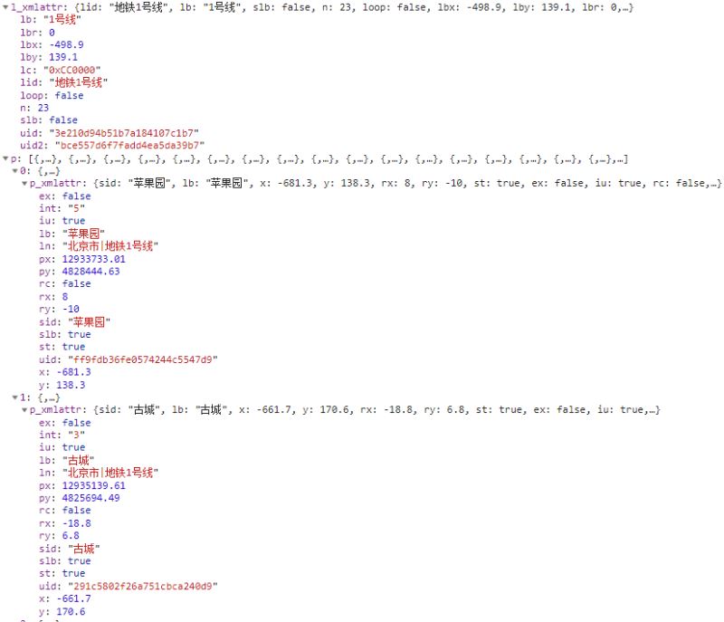 每条线路对象都有一个l_xmlattr属性和一个p属性,l_xmlattr是整条线路的属性,p是站点数组,我们看一下站点中我们需要的属性。ex是否是中转站,lb是站名,sid是站的id,rx、ry是文字偏移量,st是是否为站点(因为有的点不是站点而是为了渲染贝塞尔曲线用的),x、y是站点坐标。