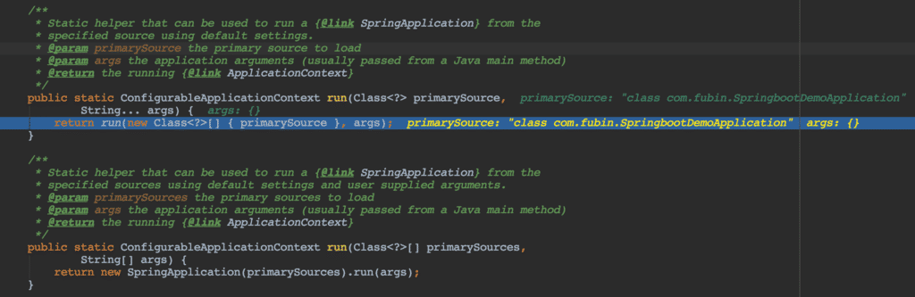 跟进run方法 : 一个用来使用默认的配置从特定的源运行SpringApplication的静态帮助类。