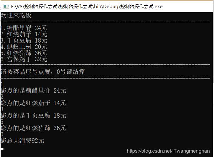 using System; using System.Collections.Generic; using System.Linq; using System.Text; using System.Threading.Tasks; namespace 控制台操作尝试 { class Program { static void Main(string[] args) { int price = 0; Console.WriteLine("欢迎来吃饭"); Console.WriteLine("==================================================================="); Console.WriteLine("1.糖醋里脊 24元"); Console.WriteLine("2 红烧茄子 14元"); Console.WriteLine("3.千页豆腐 18元"); Console.WriteLine("4.蚂蚁上树 20元"); Console.WriteLine("5.红烧猪蹄 36元"); Console.WriteLine("6.宫保鸡丁 32元"); Console.WriteLine("==================================================================="); Console.WriteLine("请按菜品序号点餐,0号键结算"); Console.WriteLine("==================================================================="); while (true) { int index = int.Parse(Console.ReadLine()); if (index==1) { Console.WriteLine("您点的是糖醋里脊 24元"); price += 24; } if (index == 2) { Console.WriteLine("您点的是红烧茄子 14元"); price += 14; } if (index ==3) { Console.WriteLine("您点的是千页豆腐 18元"); price += 18; } if (index == 4) { Console.WriteLine("您点的是蚂蚁上树 20元"); price += 20; } if (index == 5) { Console.WriteLine("您点的是红烧猪蹄 36元"); price += 36; } if (index == 6) { Console.WriteLine("您点的是宫保鸡丁 32元"); price += 32; } if (index ==0) { Console.WriteLine("您总共消费{0}元",price); } } //Console.ReadLine(); } } }