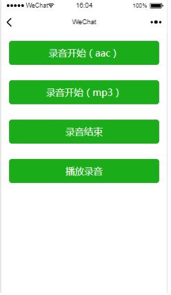 <view> <button bindtap='startRecordMp3' type='primary'>录音开始(mp3)</button> </view> <view> <button bindtap='stopRecord' type='primary'>录音结束</button> </view> <view> <button bindtap='playRecord' type='primary'>播放录音</button> </view> <view> <button bindtap='sendRecord' type='primary'>播放录音</button> </view>