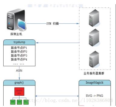 在此次实践中,通过scapy的traceroute()方法实现探测机到目标服务器的路由轨迹,整个过程的原理如下图,首先通过探测机以SYN方式进行TCP服务扫描,同时启动tcpdump进行抓包,捕获扫描过程经过的所有路由点,再通过graph()方法进行路由IP轨迹绘制,中间调用ASN映射查询IP地理信息并生成svg流程文档,最后使用ImageMagick工具将svg格式转换成png,流程结束。