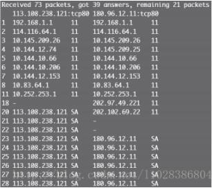 代码运行结果如下图所示,“-”表示路由节点无回应或超时;“11”表示扫描的指定服务无回应;“SA”表示扫描的指定服务有回应,一般是最后一个主机IP。