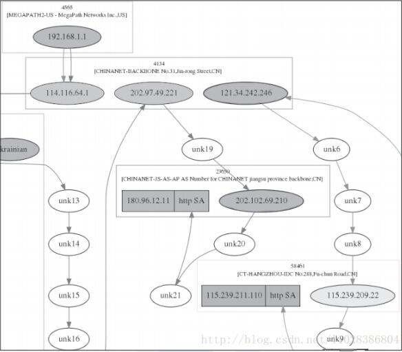 生成的路由轨迹图如下图(仅局部),“-”将使用unk*单元代替,重点路由节点将通过ASN获取所处的运营商或IDC位置,如IP“202.102.69.210”为“CHINANET-JS-AS-AP AS Number for CHINANET jiangsu province backbone,CN”意思为该IP所处中国电信江苏省骨干网。