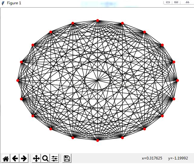 #Copyright (c)2017, 东北大学软件学院学生 # All rightsreserved #文件名称:a.py # 作 者:孔云 #问题描述: #问题分析:。代码如下: import networkx as ne #导入建网络模型包,命名ne import matplotlib.pyplot as mp #导入科学绘图包,命名mp #erdos renyi graphy rg=ne.erdos_renyi_graph(20,0.8) ps=ne.shell_layout(rg)#布置框架 ne.draw(rg,ps,with_labels=False,node_size=30) mp.show()