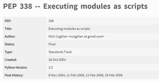 (插个题外话:Nick Coghlan 是核心开发者中的核心之一,也是第一届指导委员会的五人成员之一。记得当初看材料,他是在 2005 年被选为核心开发者的,这时间与 PEP-338 的时间紧密贴合)