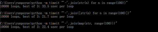 第四个同样挺有用的场景是用 timeit 在命令行中测试一小段代码的运行时间。以下的 3 段代码,用不同的方式拼接 “0-1-2-……-99” 数字串。可以直观地看出它们的效率差异: