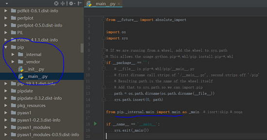“python -m pip”实际上执行的就是这个“__main__.py”文件,它主要作为一个调用入口,调用了核心的"pip._internal.main"。