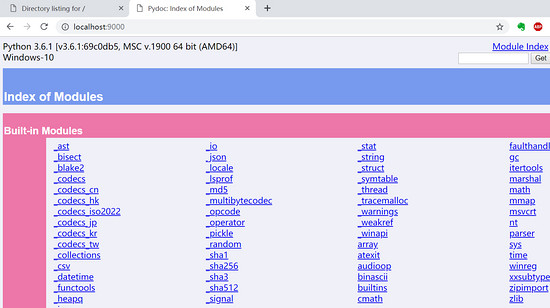 上面的命令执行了 pydoc 模块,会在 9000 端口启动一个 http 服务,在浏览器中打开,我的结果如下: