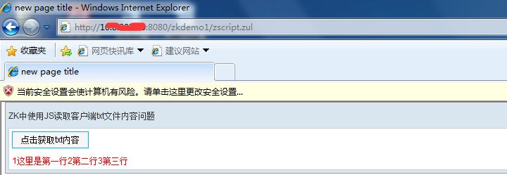 最近写一个需求时遇到一个问题,用户需要通过点击一个按钮直接读取他自己电脑上D盘的一个txt文件内容显示到页面,因为项目现在是用ZK写的.我对于ZK也是刚刚了解不就,很多都还不是很熟.起初我是想用io流去读取,然后写完发现,这样每次读取的都是服务器上的D盘下的txt文件,所以在网上找了很久.很多都是获取服务器上的文件夹或者是上传到服务器再读取.直接通过文件地址读取文件内容很少.因为这样很不安全.目前我也只找到了一种,但是只限于IE浏览器.