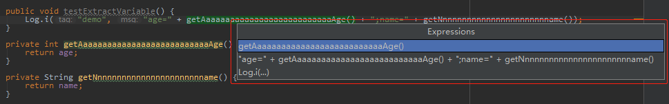 public void testExtractVariable() { Log.i("demo", "age=" + getAaaaaaaaaaaaaaaaaaaaaaaaaaaAge() + ";name=" + getNnnnnnnnnnnnnnnnnnnnnnname()); } private int getAaaaaaaaaaaaaaaaaaaaaaaaaaaAge() { return age; } private String getNnnnnnnnnnnnnnnnnnnnnnname() { return name; }