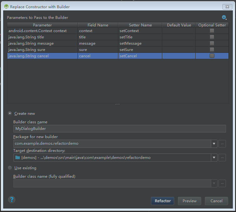 public class RefactorTest{ private void testReplaceConstructorWithBuilder(Context context){ MyDialog dialog = new MyDialog(context,"title","message","sure","cancle"); } } public class MyDialog extends Dialog { private String title; private String message; private String sure; private String cancel; public MyDialog(@NonNull Context context) { super(context); } public MyDialog(Context context, String title, String message, String sure, String cancel) { super(context); this.title = title; this.message = message; this.sure = sure; this.cancel = cancel; } }