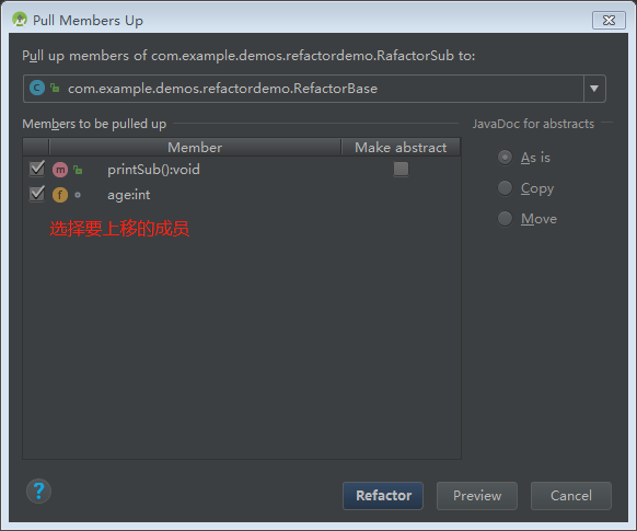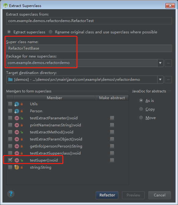 //=======RefactorTest extends RefactorTestBase======= private void testExtractSupperclass() { testSuper(); } class RefactorTestBase { public void testSuper() { System.out.print("testSuper"); } }