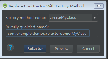 public class MyClass { private String title; private String message; private String sure; private String cancel; private MyClass(String title, String message, String sure, String cancel) { this.title = title; this.message = message; this.sure = sure; this.cancel = cancel; } public static MyClass createMyClass(String title, String message, String sure, String cancel) { return new MyClass(title, message, sure, cancel); } } public class RefactorTest { private void testReplaceConstructorWithFactory(Context context) { MyClass myClass = MyClass.createMyClass("title", "message", "sure", "cancle"); } }