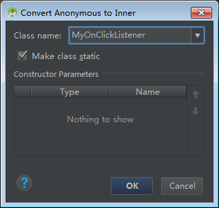 public class RefactorTest{ View view; private void testConvertAnonymousToInner(){ view.setOnClickListener(new MyOnClickListener()); } private static class MyOnClickListener implements View.OnClickListener { @Override public void onClick(View v) { } } }