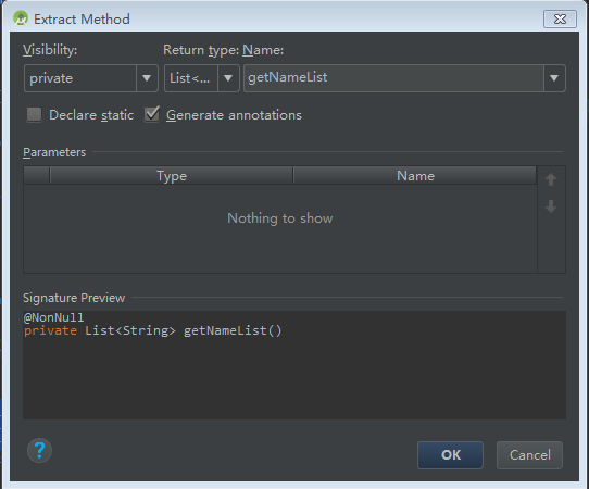 public void testExtractMethod() { List<String> nameList = getNameList(); int size = nameList.size(); } @NonNull private List<String> getNameList() { List<String> nameList = new ArrayList<>(); nameList.add("zhangshan"); nameList.add("lisi"); nameList.add("wangwu"); return nameList; }