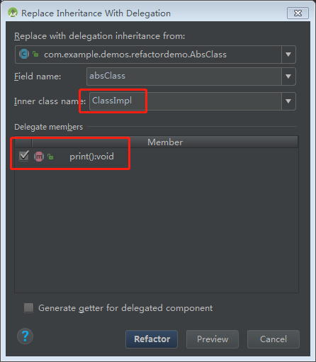 public abstract class AbsClass { public abstract void print(); } public class ClassWrapper { private final ClassImpl absClass = new ClassImpl(); public void print() { absClass.print(); } private class ClassImpl extends AbsClass { @Override public void print() { System.out.print("print"); } } } public class RefactorTest { private void testReplaceInheritanceWithDelegation() { new ClassWrapper().print(); } }