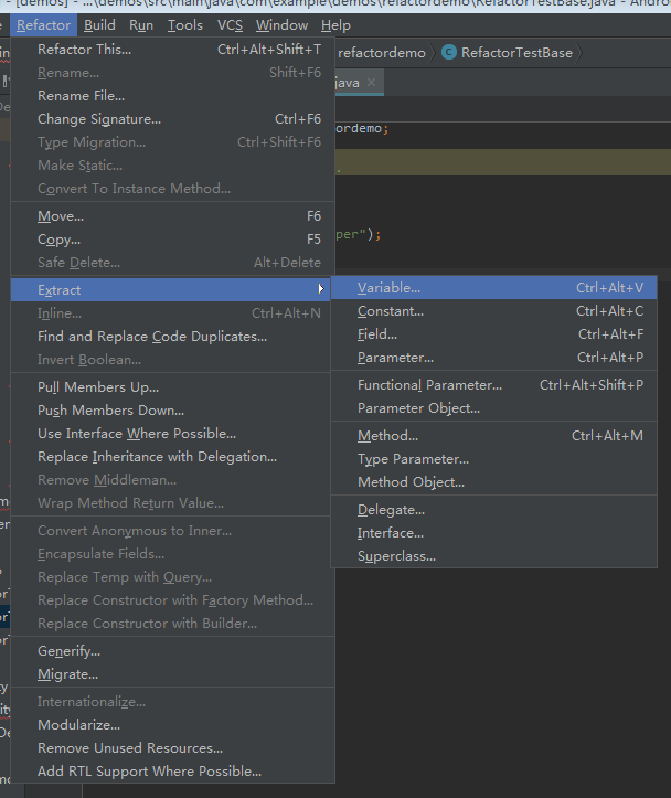 在AS的主菜单栏中有一项“Refactor”下拉菜单,点击该下拉菜单,会看到如下的界面,菜单中的每一项,都是为代码重构提供的一项自动实现功能。这么多的功能项,可见AS在代码重构功能上的强大,下面我们对这些功能项一一进行介绍。另外,还可以在编辑界面中点击右键,在弹出的菜单中也可以找到“Refactor”。