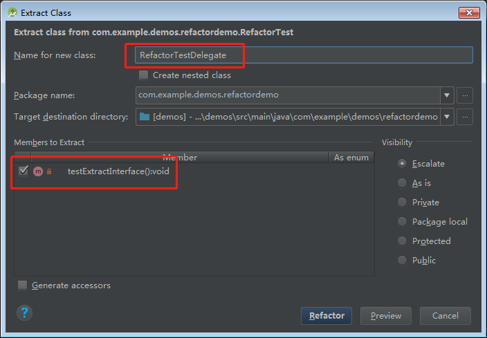 public class RefactorTestDelegate { public RefactorTestDelegate() { } public void testExtractInterface() { System.out.print("testExtractInterface"); } } public class RefactorTest{ private final RefactorTestDelegate refactorTestDelegate = new RefactorTestDelegate(); public void testExtractInterface() { refactorTestDelegate.testExtractInterface(); } }